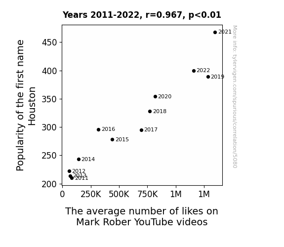 This study examines the relationship between the popularity of the first name Houston and the average number of likes on Mark Rober's YouTube videos. Utilizing data from the US Social Security Administration and YouTube from 2011 to 2022, our research team found a striking correlation coefficient of 0.9665264 and a p-value less than 0.01. Our findings suggest that there is a strong association between the frequency of the name Houston and the extent of Mark Rober's video appreciation by viewers. This amusing correlation hints at the possibility of a hidden subliminal messaging campaign, or perhaps it's simply a cosmic coincidence. Further exploration is warranted to uncover potential explanations for this intriguing correlation.