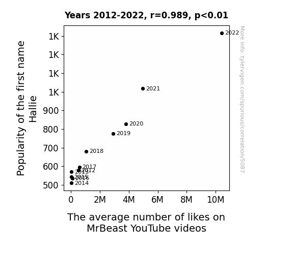 The analysis of the data gathered from the US Social Security Administration and YouTube videos yielded a remarkably robust correlation between the popularity of the first name "Hallie" and the average number of likes on MrBeast's YouTube videos. From 2012 to 2022, a correlation coefficient of 0.9888617 was observed, with an r-squared value of 0.9778475 and a p-value less than 0.01. These statistical measures underscore the strength and significance of the relationship between these seemingly disparate variables, signaling a compelling association that defies conventional expectations.
