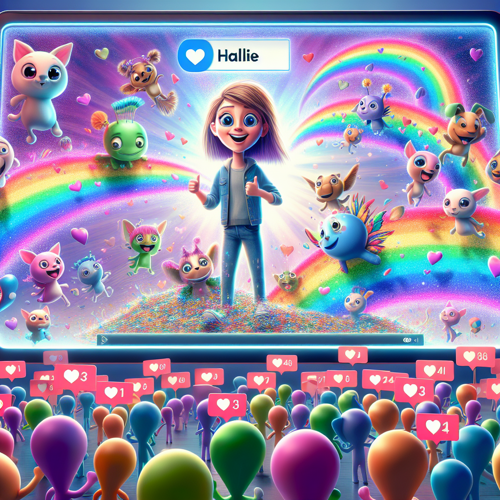 Prompt: [ Cute 2D animation ] Create a heartwarming scene where a colorful and vibrant cartoon version of MrBeast's YouTube video is playing on a screen. The video portrays MrBeast's character surrounded by various delightful elements such as smiling animals, rainbow-colored effects, and heart emojis floating around. The like button at the bottom is magnified, beaming with a radiant glow as it receives numerous joyful clicks. The name "Hallie" is prominently displayed among the list of people who have liked the video, and as the video progresses, a wave of adorable and cheerful Hallie characters begins to emerge from the like button. Each Hallie is filled with pure happiness and excitement, and as they multiply rapidly, the wave of Hallies results in a surge of colorful energy that spreads across the video, symbolizing the magical influence of Hallies in elevating the joy and popularity of MrBeast's content. The depiction should include only scenes, people, and objects, it should not include text or speech bubbles.