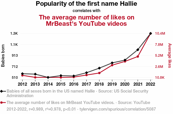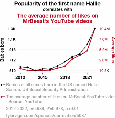 This means 97.8% of the change in the one variable (i.e., The average number of likes on MrBeast's YouTube videos) is predictable based on the change in the other (i.e., Popularity of the first name Hallie) over the 11 years from 2012 through 2022.
