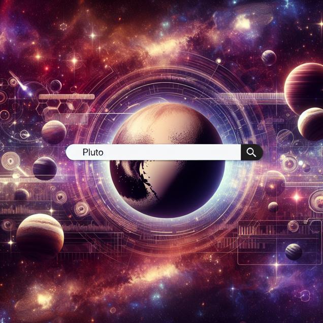 User prompt: Please respond with an image generation prompt that would be likely to create an interesting visual using DALLE-3, using the following style: [ a funny image you would see on reddit ] and depicting this scene: In the YouTube thumbnail, a cosmic backdrop filled with stars, planets, and galaxies frames a bold and trendy Numberphile video title in funky, colorful font, drawing attention to the captivating topic of "Is Pluto a Planet?" The video title is surrounded by an aura of coolness, as if Pluto's enigmatic status has imbued it with cosmic allure. Meanwhile, the screen is filled with Google search results for the same question, highlighting the widespread curiosity surrounding Pluto's planetary identity. Overall, the scene captures the celestial pull of Pluto sparking an out-of-this-world surge in 'hip and with it' content from Numberphile. Keep the visual depiction simple. Do not include any words or speech bubbles.