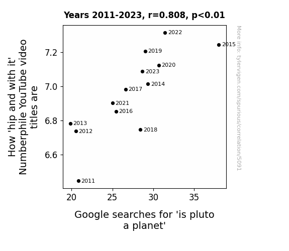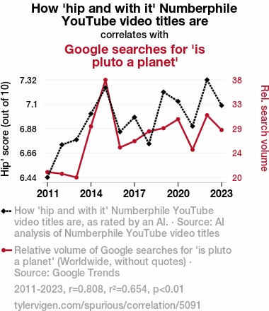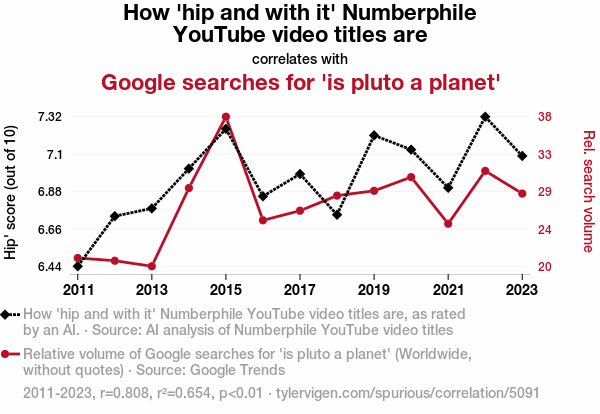 This means 65.4% of the change in the one variable (i.e., Google searches for 'is pluto a planet') is predictable based on the change in the other (i.e., How 'hip and with it' Numberphile YouTube video titles are) over the 13 years from 2011 through 2023.