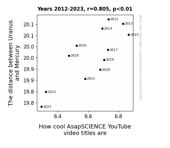 This means 64.8% of the change in the one variable (i.e., How cool AsapSCIENCE YouTube video titles are) is predictable based on the change in the other (i.e., The distance between Uranus and Mercury) over the 12 years from 2012 through 2023.