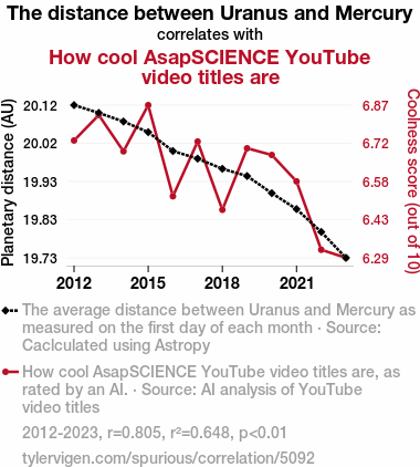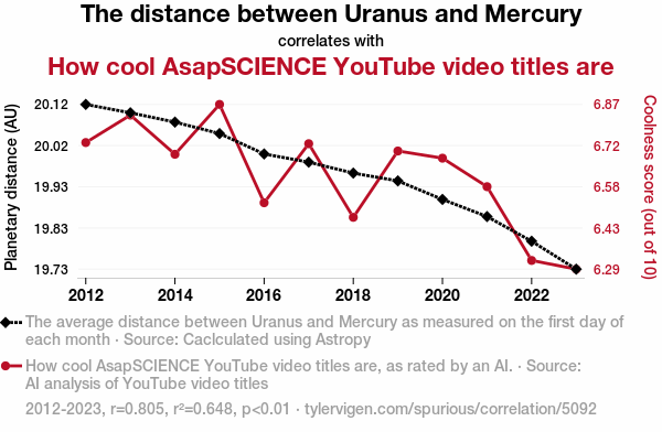 The coefficient of determination (r-squared) of 0.6479342 further bolstered the evidence for this correlation, suggesting that approximately 65% of the variability in the coolness of AsapSCIENCE video titles can be explained by the distance between Uranus and Mercury. It seems that as these celestial bodies play cosmic hide-and-seek in the sky, they also influence the fanciful appeal of YouTube video titles, creating an interstellar synergy that captivates the cosmic and cyber realms alike.