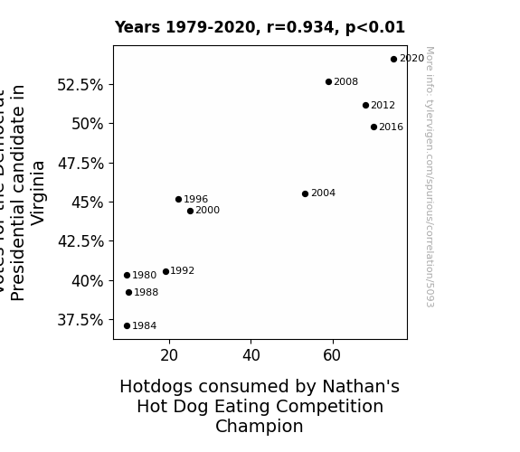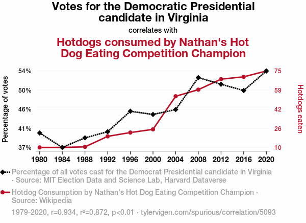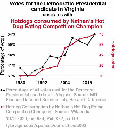 - The spurious research paper: Blue Wave Votes and Hogged Hotdogs: A Rhyme-tastic Study of Democrat Presidential Candidate Votes in Virginia and Nathan's Hot Dog Eating Competition Champions