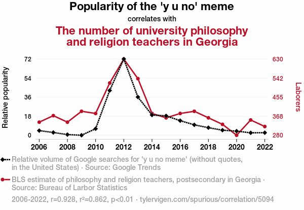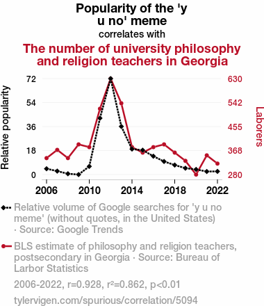 User prompt: Please provide potential search keywords for a paper titled Meme-taphysical Connections: Exploring the Relationship Between the 'y u no' Meme Popularity and the Number of University Philosophy and Religion Teachers in Georgia with an abstract of In this paper, we delved into the intriguing yet often overlooked connection between internet meme culture and the academic realm of philosophy and religion in the state of Georgia. Utilizing data from Google Trends and the Bureau of Labor Statistics, we rigorously examined the correlation between the widespread popularity of the 'y u no' meme and the number of teaching roles in these disciplines. Our findings revealed a remarkably high correlation coefficient of 0.9284803 with a significance level of p < 0.01 for the years 2006 to 2022, providing compelling evidence for the influence of internet memes on academic disciplines.