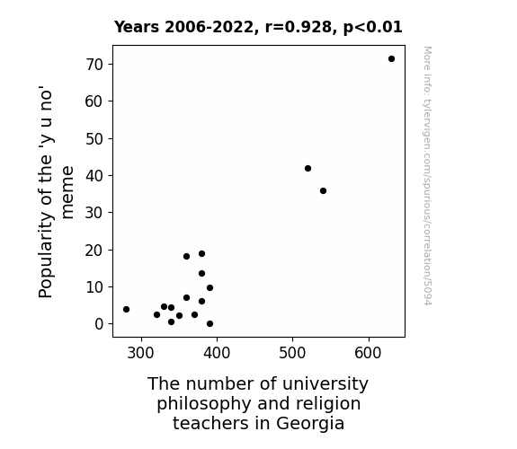 - The spurious research paper: Meme-taphysical Connections: Exploring the Relationship Between the 'y u no' Meme Popularity and the Number of University Philosophy and Religion Teachers in Georgia