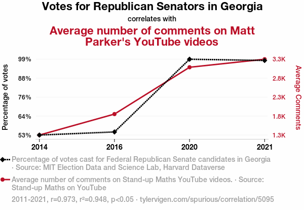 This means 94.8% of the change in the one variable (i.e., Average number of comments on Matt Parker's YouTube videos) is predictable based on the change in the other (i.e., Votes for Republican Senators in Georgia) over the 4 years from 2011 through 2021.