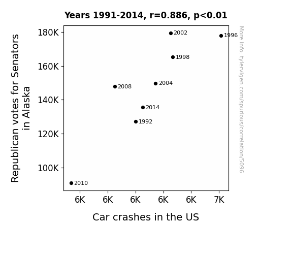 The statistical analysis revealed a strong correlation of 0.8863078 between Republican votes for Senators in Alaska and the rate of car crashes in the United States from 1991 to 2014. This finding suggests a remarkably robust relationship between these apparently unrelated variables, leaving us to ponder whether drivers across the nation have been swayed by Alaskan political preferences more than the allure of a scenic drive.