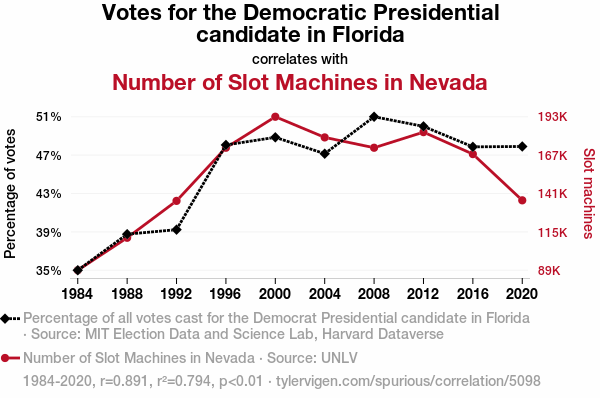 "Democratic votes Florida, slot machine effect," "correlation between slot machines and Democratic votes," "Florida presidential election slot machines," "Nevada slot machines impact on Democratic votes," "MIT Election Data and Science Lab slot machines study," "Harvard Dataverse correlation research slot machines"