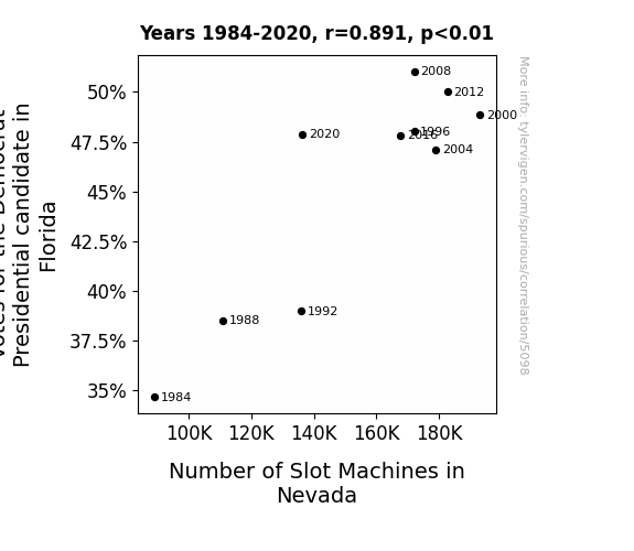 This means 79.4% of the change in the one variable (i.e., Number of Slot Machines in Nevada) is predictable based on the change in the other (i.e., Votes for the Democratic Presidential candidate in Florida) over the 10 years from 1984 through 2020.