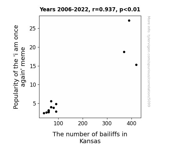 The analysis of the data collected from 2006 to 2022 revealed an eye-catching correlation between the popularity of the "i am once again" meme and the number of bailiffs in the state of Kansas. The correlation coefficient of 0.9371458 and an r-squared of 0.8782423 indicated a remarkably robust relationship between these seemingly disparate variables. As a result, we can confidently assert that the fluctuations in meme popularity are highly predictive of the changes in the presence of bailiffs in Kansas.