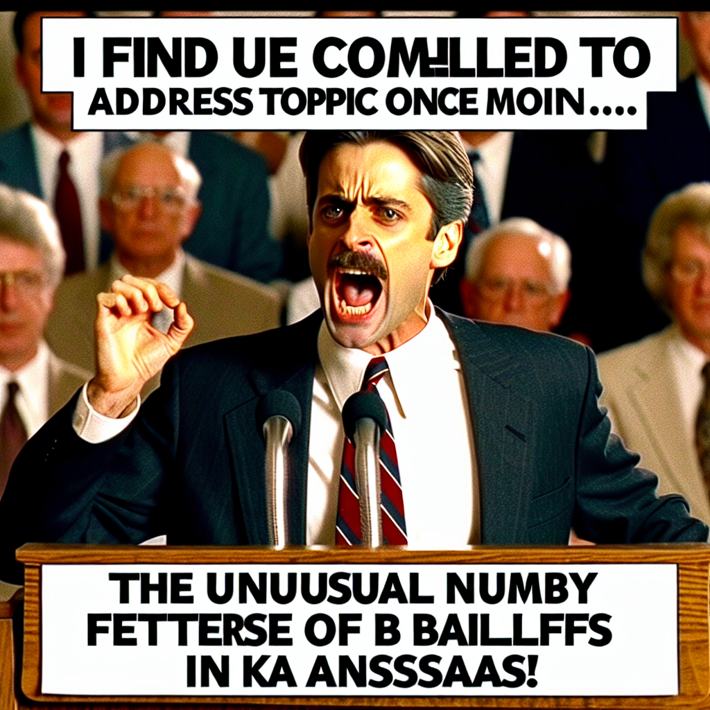 User prompt: Please make up a funny explanation for how an increase in Popularity of the 'i am once again' meme caused The number of bailiffs in Kansas to increase. Add a funny one-liner at the end.