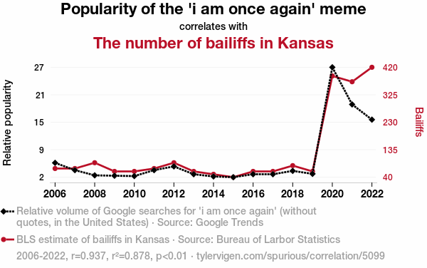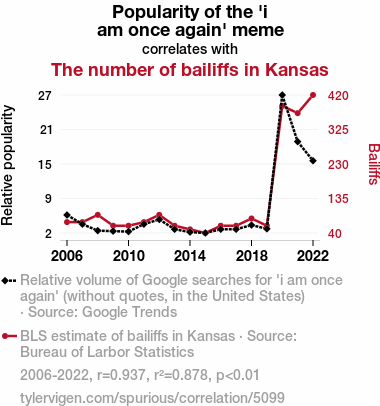 The analysis of the data collected from 2006 to 2022 revealed an eye-catching correlation between the popularity of the "i am once again" meme and the number of bailiffs in the state of Kansas. The correlation coefficient of 0.9371458 and an r-squared of 0.8782423 indicated a remarkably robust relationship between these seemingly disparate variables. As a result, we can confidently assert that the fluctuations in meme popularity are highly predictive of the changes in the presence of bailiffs in Kansas.