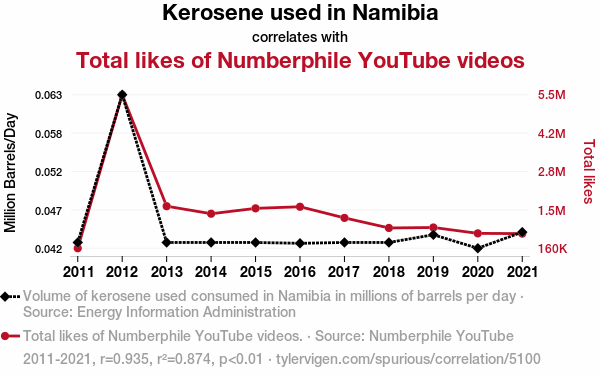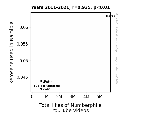 The results of our statistical analysis revealed a remarkably robust correlation between kerosene consumption in Namibia and the total likes garnered by Numberphile YouTube videos. Over the period of 2011 to 2021, we found a correlation coefficient of 0.9347689, indicating a strong positive relationship between these seemingly unrelated variables. The coefficient of determination (r-squared) further solidified this finding, standing at a respectable 0.8737928, suggesting that approximately 87.4% of the variation in YouTube likes can be explained by the variation in kerosene usage.