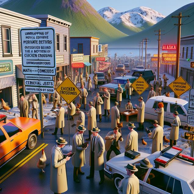 ChatGPT: Generate an image of a bustling Alaskan town scene where private detectives are gathered around a cleverly labeled "Chicken Crossings" sign. The detectives are animatedly discussing and investigating the mystery of why the chicken crossed the road. This scene should be juxtaposed with an area where Stand-up Maths video titles are sitting unattended, symbolizing the intellectual punchlines waiting to be discovered. The atmosphere should feel cyber and tech-infused, incorporating elements of data art to add a futuristic touch to the visual.