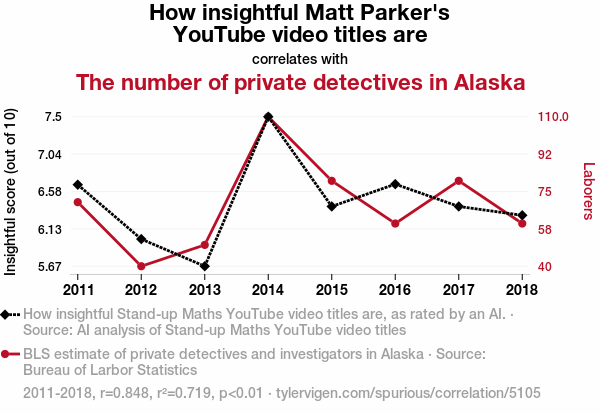 User prompt: Please make up a funny explanation for how a decrease in How insightful Stand-up Maths YouTube video titles are caused The number of private detectives in Alaska to decrease.