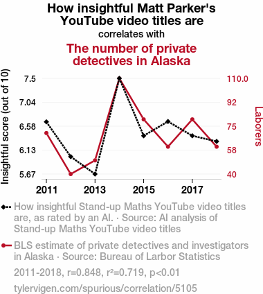 - The spurious research paper: The Stand-Up Maths of Private Eyes: A Statistical Analysis of YouTube Video Titles and the Number of Private Detectives in Alaska