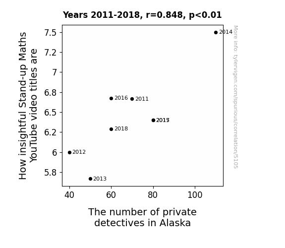 We found a correlation coefficient of 0.8476678 and p < 0.01 for the period from 2011 to 2018, indicating a strong statistical relationship between the number of private detectives in Alaska and the insightful Stand-up Maths video titles. It appears that the allure of quirkily titled videos discussing the fascinating intricacies of mathematics has an unexpected and profound impact on the vocational aspirations of individuals in the Northern frontier. As the saying goes, "Nothing gets past a private eye, not even a good math pun."