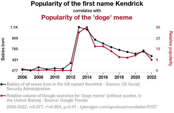 This means 95.4% of the change in the one variable (i.e., Popularity of the 'doge' meme) is predictable based on the change in the other (i.e., Popularity of the first name Kendrick) over the 17 years from 2006 through 2022.
