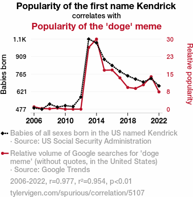 User prompt: Please provide potential search keywords for a paper titled From Kendrick to Doge: Unleashing the Caninely Coincidental Correlation with an abstract of In this study, we investigated the seemingly barking mad connection between the popularity of the first name "Kendrick" and the rise of the "doge" meme. Harnessing data from the US Social Security Administration and Google Trends, our research team delved into uncharted territories to explore whether there exists a substantive correlation between these seemingly unrelated cultural phenomena. Through our rigorous analysis, we unearthed a correlation coefficient of 0.9767168 and a significance level of p < 0.01 for the period spanning 2006 to 2022. Our findings not only fetched intriguing insights into the whimsical world of nomenclature and internet humor but also wagged a tail of curiosity about the interconnectedness of human behavior and media trends. This study leaves us pondering: could there be a paw-sible explanation for this uncanny correlation, or is it simply an amusing coincidence that tickles our intellectual funny bone?