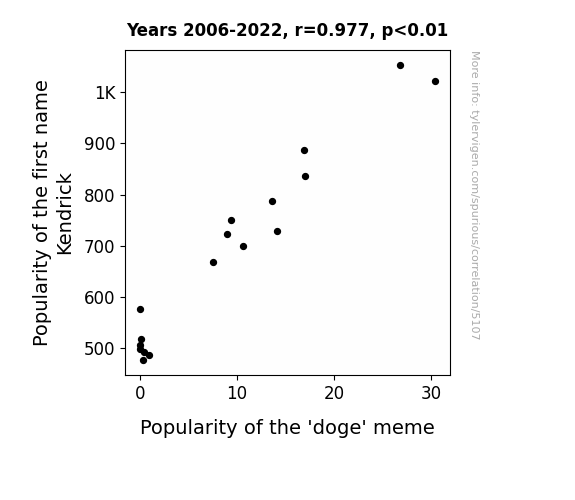 This study, while certainly entertaining and quirky, invites further pondering on the tail-wagging truth behind the connection between the name "Kendrick" and the "doge" meme. What hidden forces are at play here, driving these seemingly disparate cultural phenomena to dance in statistical step? Our research, although undoubtedly playful, tiptoes charmingly close to the edge of a deeper, more profound truth – a truth that may, indeed, be stranger than fiction. As we close the leash gap on this particular inquiry, we invite fellow researchers to join us in sniffing out more tantalizing correlations in the whimsical world of nomenclature and internet culture, where surprises abound and the unexpected beckons like a siren's bark.