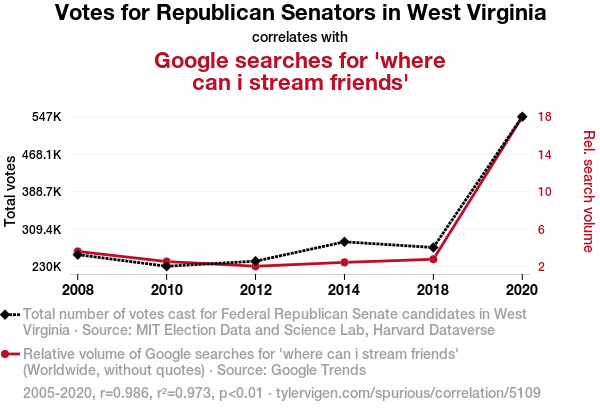 West Virginia, Republican votes, Senators, Google search, "where can I stream Friends," political leanings, television preferences, MIT Election Data and Science Lab, Harvard Dataverse, Google Trends, correlation coefficient, political sentiment, television viewing habits, political decision-making, sitcom streaming, cultural consumption, political behavior