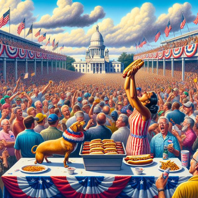 User prompt: Please describe a visual scene that prominently depicts both Votes for the Democrat Presidential candidate in Rhode Island and Hotdogs consumed by Nathan's Hot Dog Eating Competition Champion, in the following situation: As the political heat rose, so did the demand for hot dogs! It seems the democratic process had a wurst-case scenario effect on competitive eating. Whether it's the candidates' relish for change or the voters' appetite for progress, one thing's for sure: in the race for deliciousness, there's no room for indecision. So, let's ketchup on the campaign trail and mustard the courage to elect a new flavor of leadership! Remember, when it comes to politics and hot dogs, it's all about the buns and the ballots!. Keep the description simple.