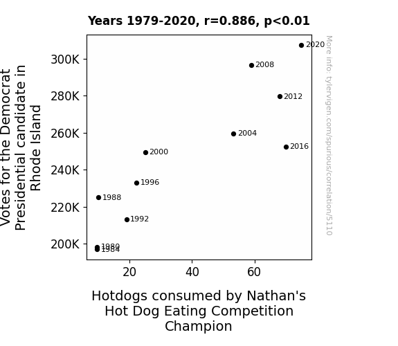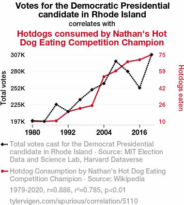 - The spurious research paper: From Ballots to Buns: The Link Between Votes for the Democratic Presidential Candidate in Rhode Island and Hotdogs Devoured by Nathan's Hot Dog Eating Competition Champion