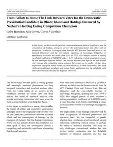 User prompt: Please provide potential search keywords for a paper titled From Ballots to Buns: The Link Between Votes for the Democratic Presidential Candidate in Rhode Island and Hotdogs Devoured by Nathan's Hot Dog Eating Competition Champion with an abstract of In this paper, we delve into the peculiar connection between political preferences and the consumption of hotdogs, aiming to uncover the underlying factors that drive such an unexpected correlation. Leveraging data from the MIT Election Data and Science Lab, Harvard Dataverse, and the ever-reliable repository of knowledge, Wikipedia, we meticulously scrutinize the trends from 1979 to 2020. Our analysis reveals a striking correlation coefficient of 0.8858990 and p < 0.01, indicating a robust association between the two seemingly disparate entities. Our findings not only shed light on the ties between civic choices and competitive eating prowess but prompt us to ponder whether these preferences stem from shared values, societal influences, or mere coincidence. This study challenges traditional paradigms and invites further exploration into the delightful realm where electoral outcomes and hot dog feats intertwine.