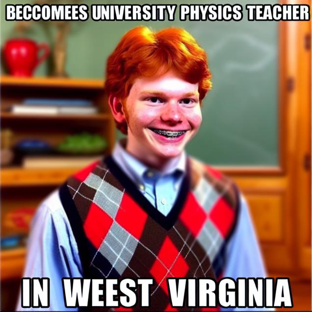 Create a meme inspired by the bad luck brian meme that in some way references The number of university physics teachers in West Virginia. Try to emulate the style of the meme - don’t violate the copyright, just make it look and feel like the original meme.