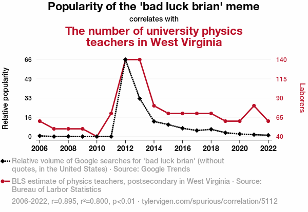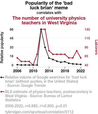 User prompt: Please provide potential search keywords for a paper titled When Bad Luck Brian Met Physics: An Unlikely Connection Between Memes and Academic Staffing with an abstract of In a world where internet memes reign supreme, we often find ourselves pondering the peculiar connections they have with the most unexpected subjects. In this study, we dive into the surprising correlation between the popularity of the 'bad luck brian' meme and the number of university physics teachers in West Virginia. Our research team, armed with data from Google Trends and the Bureau of Labor Statistics, sought to unravel this curious entanglement.
