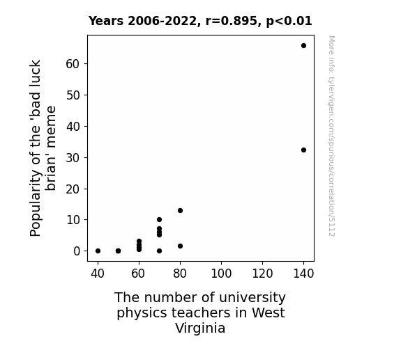 This means 80% of the change in the one variable (i.e., The number of university physics teachers in West Virginia) is predictable based on the change in the other (i.e., Popularity of the 'bad luck brian' meme) over the 17 years from 2006 through 2022.