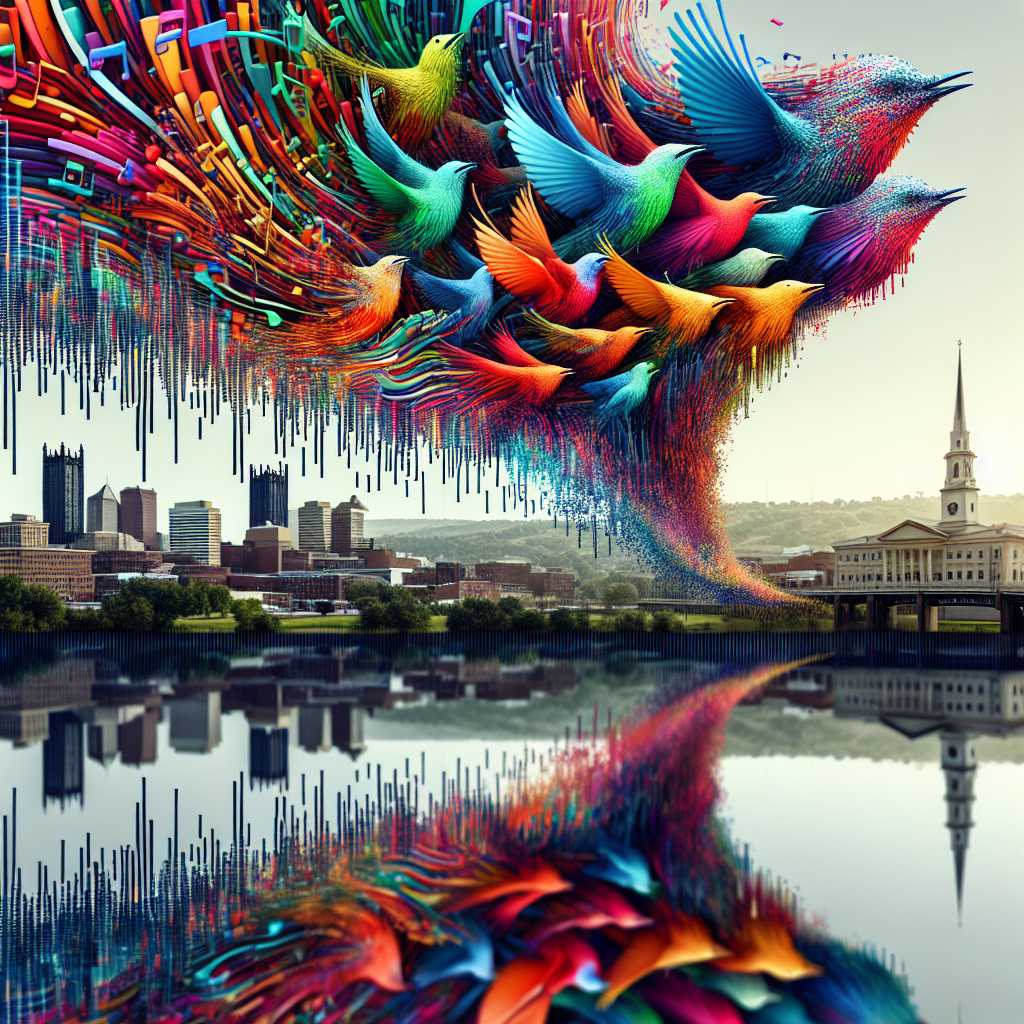 Prompt: Generate an image of a stunning magazine cover with the headline "A Symphony in the Skies: The Avian Sensation" showcasing a vivid depiction of Harrisburg, Pennsylvania. The image should capture the captivating moment when a flock of birds forms an a cappella group, creating a harmonious melody that fills the sky. The birds' vibrant colors and intricate formations should be the focal point, overshadowing the cityscape below and evoking a sense of the surprising and enchanting spectacle. The depiction should include only scenes, people, and objects, it should not include text or speech bubbles.