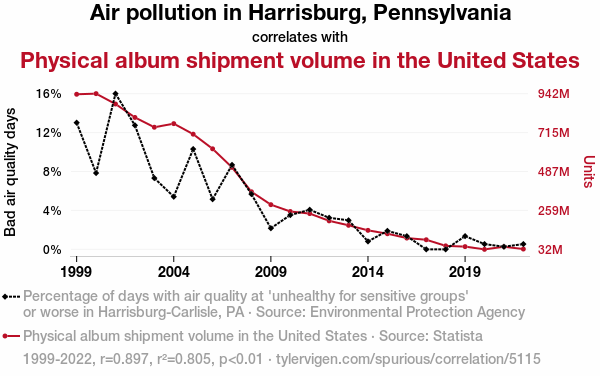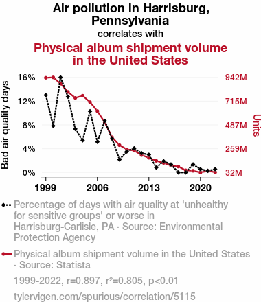 This means 80.5% of the change in the one variable (i.e., Physical album shipment volume in the United States) is predictable based on the change in the other (i.e., Air pollution in Harrisburg, Pennsylvania) over the 24 years from 1999 through 2022.