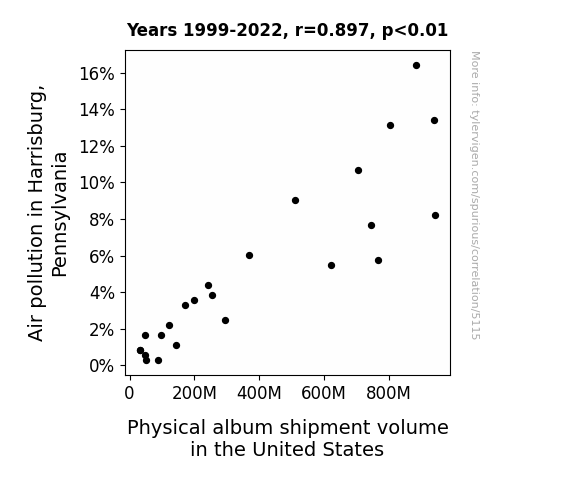 Regarding the correlation analysis, the research findings indicate a strong positive correlation between air pollution in Harrisburg, Pennsylvania, and the volume of physical album shipments in the United States during the period from 1999 to 2022. The correlation coefficient of 0.8974593 suggests a substantial linear relationship between the two variables. It seems that as the air quality worsens in Harrisburg, the demand for physical albums experiences an unexpected surge across the United States. One might say that amidst the pollution, the air has become more suitable for "air guitar" enthusiasts.