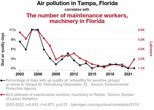 - The spurious research paper: Breath in the Machinery: Examining the Correlation Between Air Pollution in Tampa, Florida and the Employment of Maintenance Workers