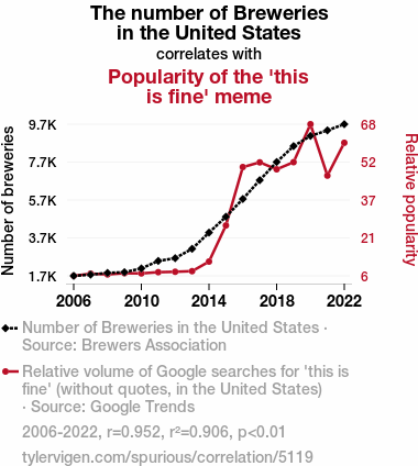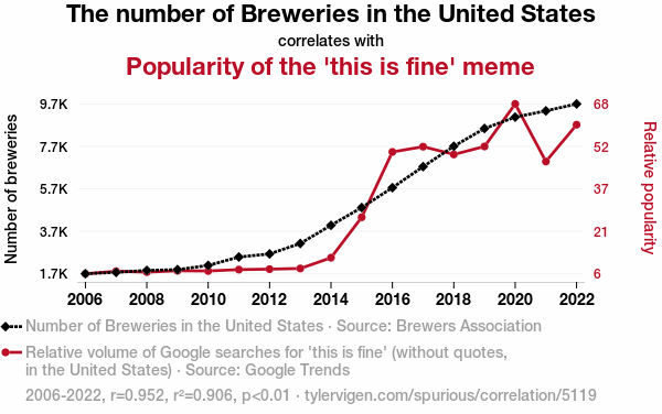 This means 90.6% of the change in the one variable (i.e., Popularity of the 'this is fine' meme) is predictable based on the change in the other (i.e., The number of Breweries in the United States) over the 17 years from 2006 through 2022.