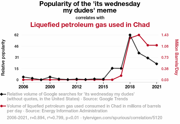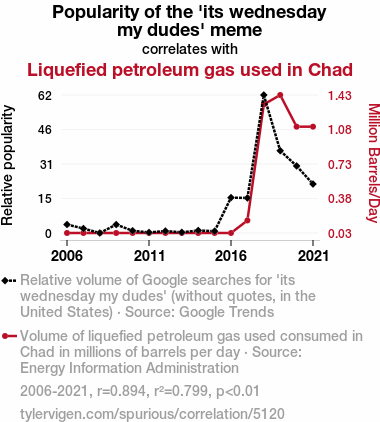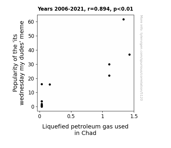 - The spurious research paper: Fueling the Hilarity: Exploring the Correlation between the Popularity of the 'its wednesday my dudes' Meme and Liquefied Petroleum Gas Consumption in Chad