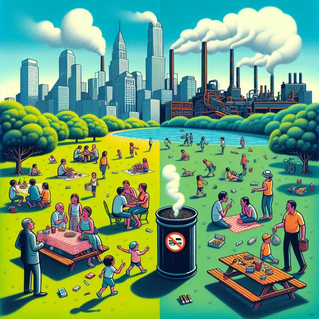 Prompt: Prompt: Generate an image that symbolizes the environmental impact of reduced smoking in Akron, Ohio. Depict families enjoying a picnic in a park while children play games under a clear, bright sky. On one side, show people disposing of cigarette packets and used smoking supplies into a large trash can with a "No Smoking" sign. On the other side, illustrate smokestacks from factories emitting less smoke, and the air quality visibly improving. Emphasize the connection between decreased spending on tobacco products and the cleaner air, portraying a transformation in the city's environment. The depiction should include only scenes, people, and objects, it should not include text or speech bubbles.