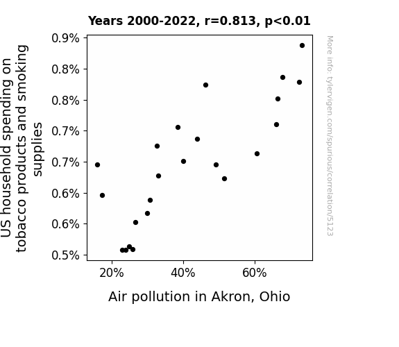 The p-value of less than 0.01 highlights the statistical significance of this correlation, further reinforcing the robustness of the relationship between household spending on tobacco products and smoking supplies and air pollution in Akron.