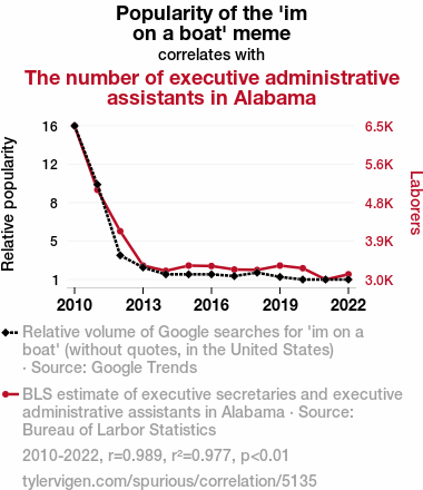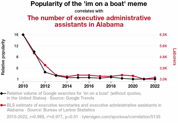 'im on a boat' meme, internet memes, executive administrative assistants, Alabama, Google Trends, Bureau of Labor Statistics, correlation coefficient, statistical significance, occupational trends, professional landscapes