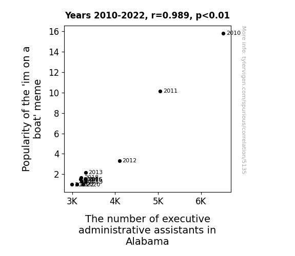 This means 97.7% of the change in the one variable (i.e., The number of executive administrative assistants in Alabama) is predictable based on the change in the other (i.e., Popularity of the 'im on a boat' meme) over the 13 years from 2010 through 2022.