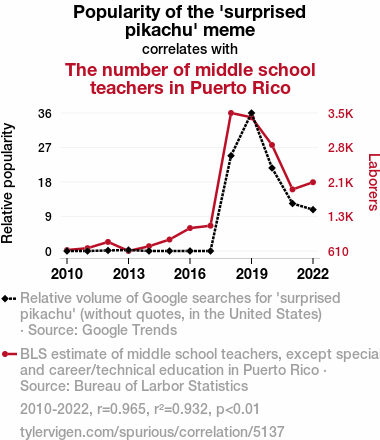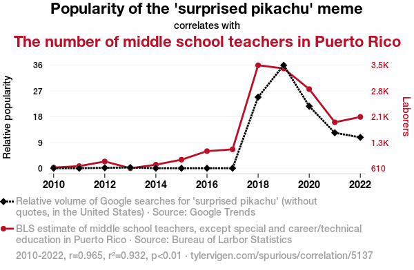User prompt: Please provide potential search keywords for a paper titled Putting the Surprised in Statistical Significance: An Examination of the 'Surprised Pikachu' Meme and its Impact on Middle School Teacher Population in Puerto Rico with an abstract of In this paper, we dive into the fascinating world of meme culture and its inexplicable connection to the labor force dynamics of middle school teachers in Puerto Rico. Utilizing Google Trends data and Bureau of Labor Statistics records, our study sought to investigate the relationship between the ever-popular 'surprised Pikachu' meme and the number of middle school teachers in Puerto Rico. Our findings reveal a remarkably high correlation coefficient of 0.9652391 and a p-value less than 0.01 for the period spanning 2010 to 2022, suggesting a strong and statistically significant association between the two seemingly unrelated phenomena.