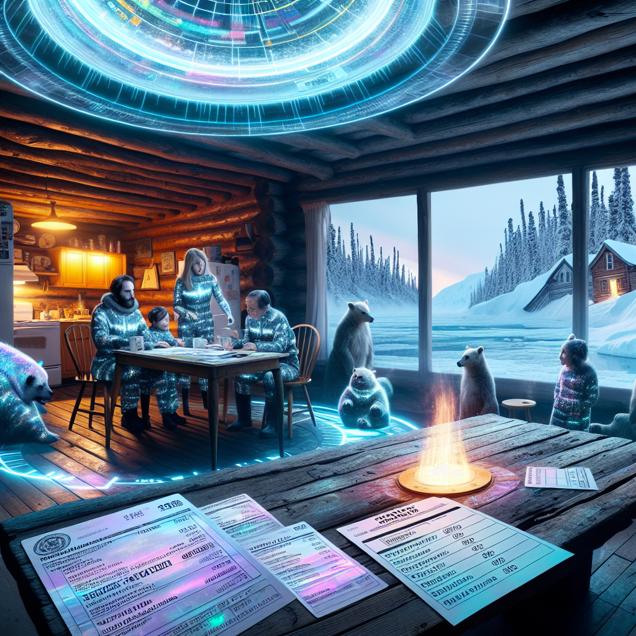 Prompt: [Sci-fi fantasy] In a remote log cabin deep in the Alaskan wilderness, a family is seated around the weathered kitchen table. The worn wood glows in the warm light of a flickering holographic fire. On the table, futuristic property tax bills float above the surface, pulsing with an otherworldly glow. Next to them, a holographic ballot for the Democrat Presidential candidate hovers, emitting a faint, celestial hum. The family, clad in shimmering, thermal fabric, animatedly discusses the soaring property taxes while eagerly marking their votes for the futuristic Democrat candidate. Through the cabin's transparent walls, the icy landscape outside shimmers with an ethereal blue glow, reflecting the family's increasing support for the blue party as the property tax bills continue to stack up in a surreal, snowy tableau. The depiction should include only scenes, people, and objects, it should not include text or speech bubbles.