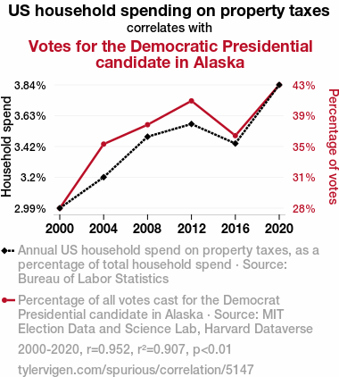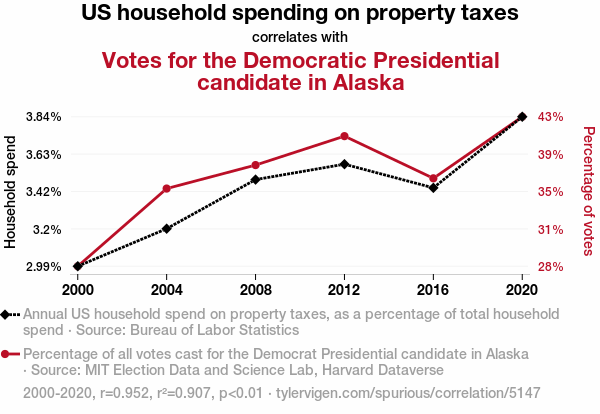 This means 90.7% of the change in the one variable (i.e., Votes for the Democratic Presidential candidate in Alaska) is predictable based on the change in the other (i.e., US household spending on property taxes) over the 6 years from 2000 through 2020.