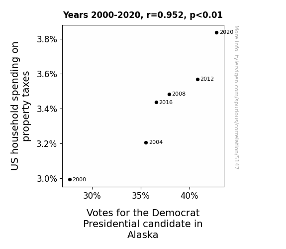 The relationship between US household spending on property taxes and the votes for the Democrat Presidential candidate in Alaska has been a matter of enduring interest. In this study, we sought to shed light on this connection by delving into the comprehensive data from the Bureau of Labor Statistics and MIT Election Data and Science Lab, Harvard Dataverse. Our findings revealed a striking correlation coefficient of 0.9524958 and p < 0.01 between property tax expenditure and votes cast for the Democratic Presidential nominee from 2000 to 2020 in the frigid terrain of Alaska.