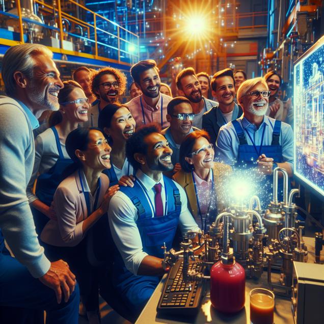ChatGPT: Generate an image showing a vibrant workshop set in Alabama. In the center of the workshop, a group of chemical equipment operators and tenders are gathered around a screen, watching tech-related YouTube videos. The catchy titles on the screen sparkle, drawing excited laughter from the group. As their amusement grows, a wave of inspiration fills the room, igniting a chain reaction of positive energy. Show the operators and tenders feeling uplifted and inspired. As a result of the enhanced morale, depict a surge of new operators and tenders entering the scene, eager to join the positively charged environment. The room should buzz with shared excitement. Capture the essence of the 'punny' business of chemistry, showcasing the workforce's newfound job satisfaction and the actual chemical reaction sparked by the positive energy.