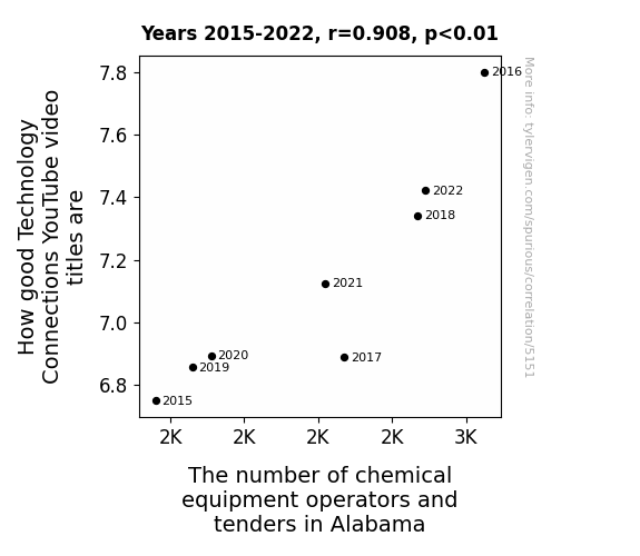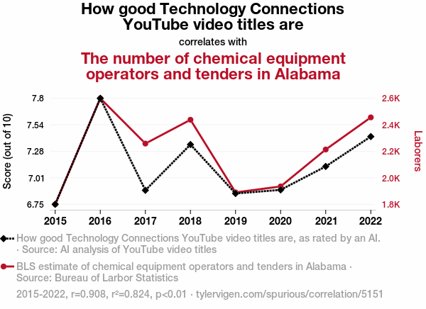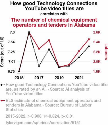 This means 82.4% of the change in the one variable (i.e., The number of chemical equipment operators and tenders in Alabama) is predictable based on the change in the other (i.e., How good Technology Connections YouTube video titles are) over the 8 years from 2015 through 2022.