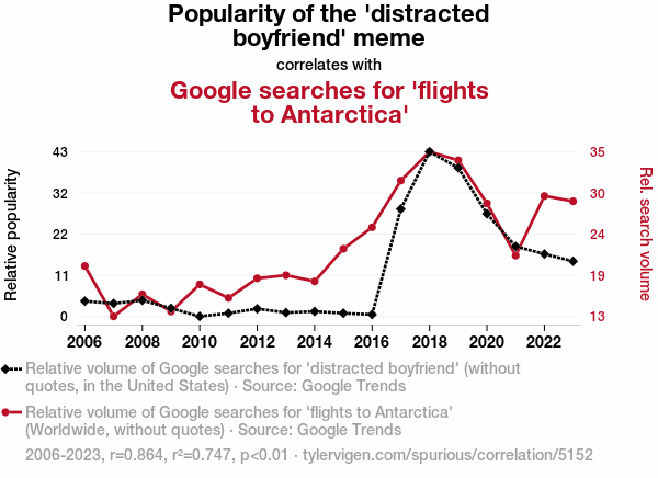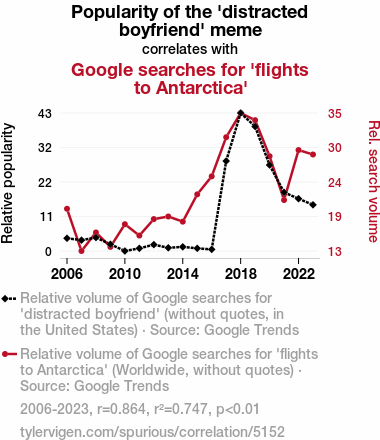 - The spurious research paper: Flight of the DistRAKTed: Exploring the Correlation Between the 'Distracted Boyfriend' Meme Popularity and Google Searches for 'Flights to Antarctica'